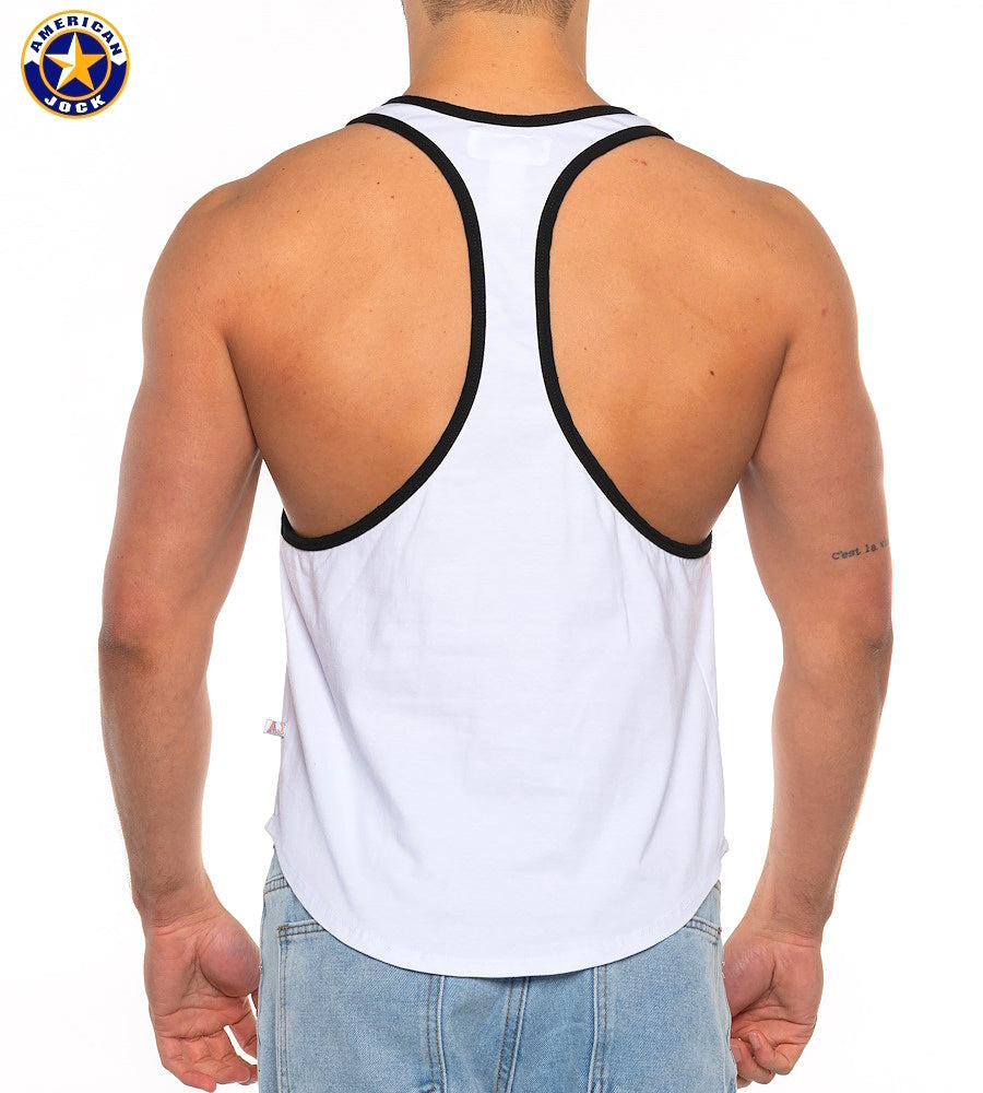 Show off your athletic form with the A J basics bodybuilder tank by AMERICAN JOCK label. Tailored in soft-breathable cotton/lycra fabric for a comfortable fit, this gym top features a scoop neck front, deep 32” armhole circumference and eye-catching Y-back design. Take your styling game to the next level with the classic colors and contrast trim-perfect for motivating yourself to the next level of fitness.