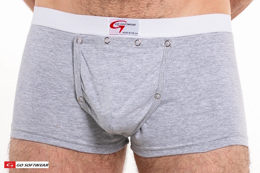 Experience the next evolution in boxer briefs with GO SOFTWEAR’s innovative design. The snap front boxer brief crafted from a soft cotton/lycra fabric blend has a snug fit and features a detachable snap-front codpiece that hides a built-in fabric c-ring. It lifts and shapes your ‘package’ for a bold, enhanced silhouette that commands attention.