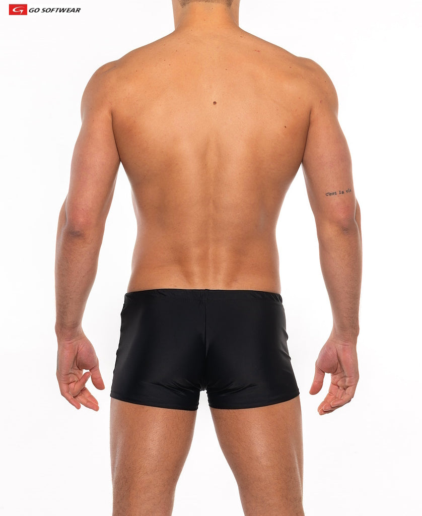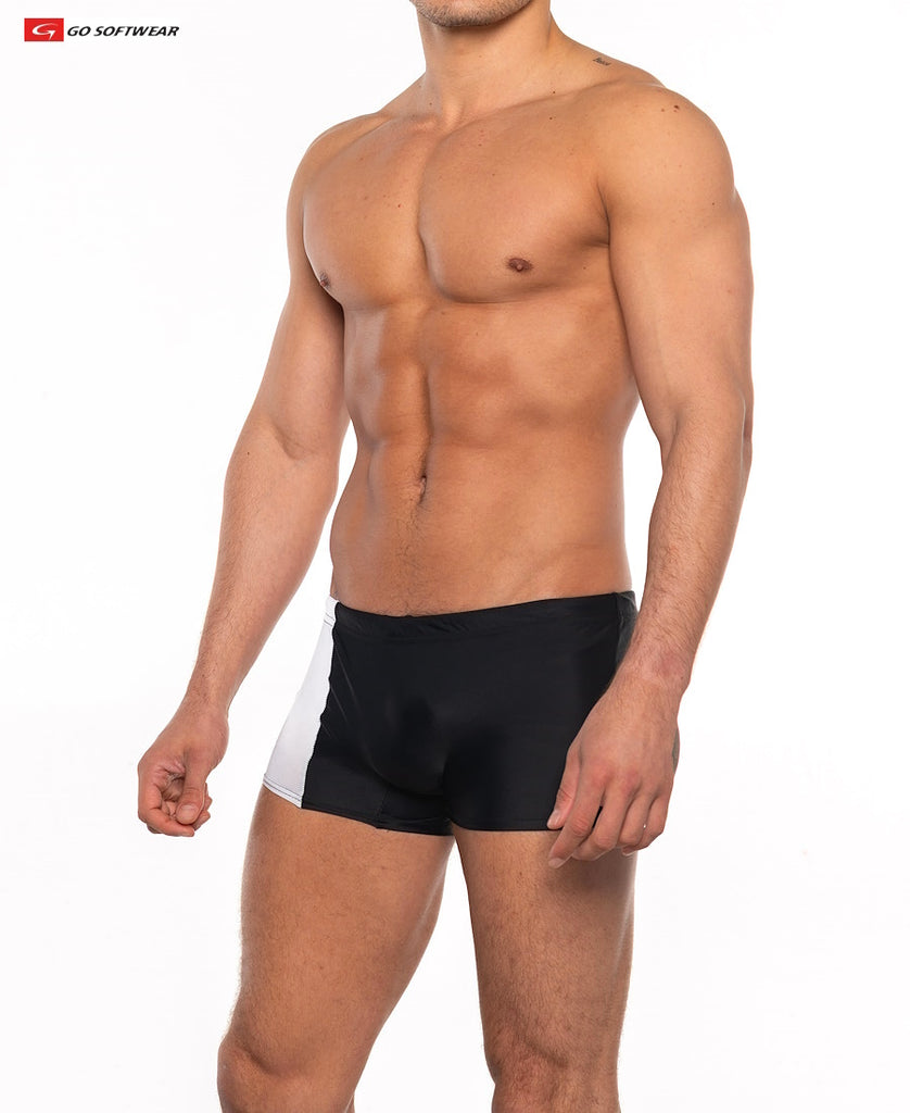 This popular bathing suit exclusively by GO SOFTWEAR is like no other, thanks to the unique enhancement feature. The Priapos sq-cut swimsuit is made from nylon/spandex fabric with 4 way stretch with a built-in cock-ring panel sewn into the front pouch to give your privates a lift UP and OUT for a prominent front and side silhouette. The garment also features a 1-inch covered waist band with inner drawcord, 7-inch outer side seam with contrast color side panel for a sporty look.